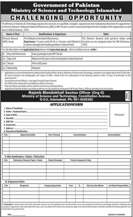 Ministry of Science and Technology MOST invites applications for job positions advertised in daily The News dated 19 May 2024 for following vacancies in Islamabad, islamabad Islamabad Pakistan.