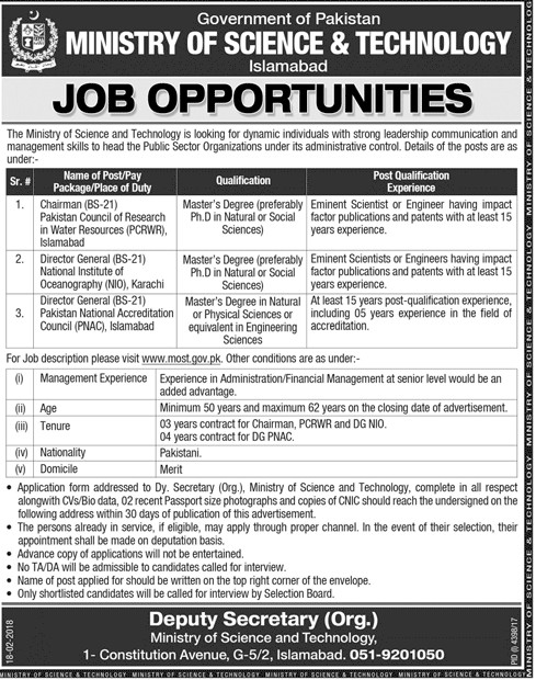 Latest Ministry of Science and Technology MOST Management Posts Islamabad 2025