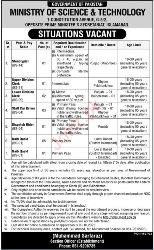 Ministry of Science and Technology MOST jobs advertisement dated about 18 September 2022 in daily Ausaf Newspaper invites application for the vacant post of naib qasid, stenotypist, udc, dispatch rider and ldc in Islamabad, islamabad Islamabad Pakistan. Preferred Education is Middle, Bachelor, Matric and Intermediate etc.