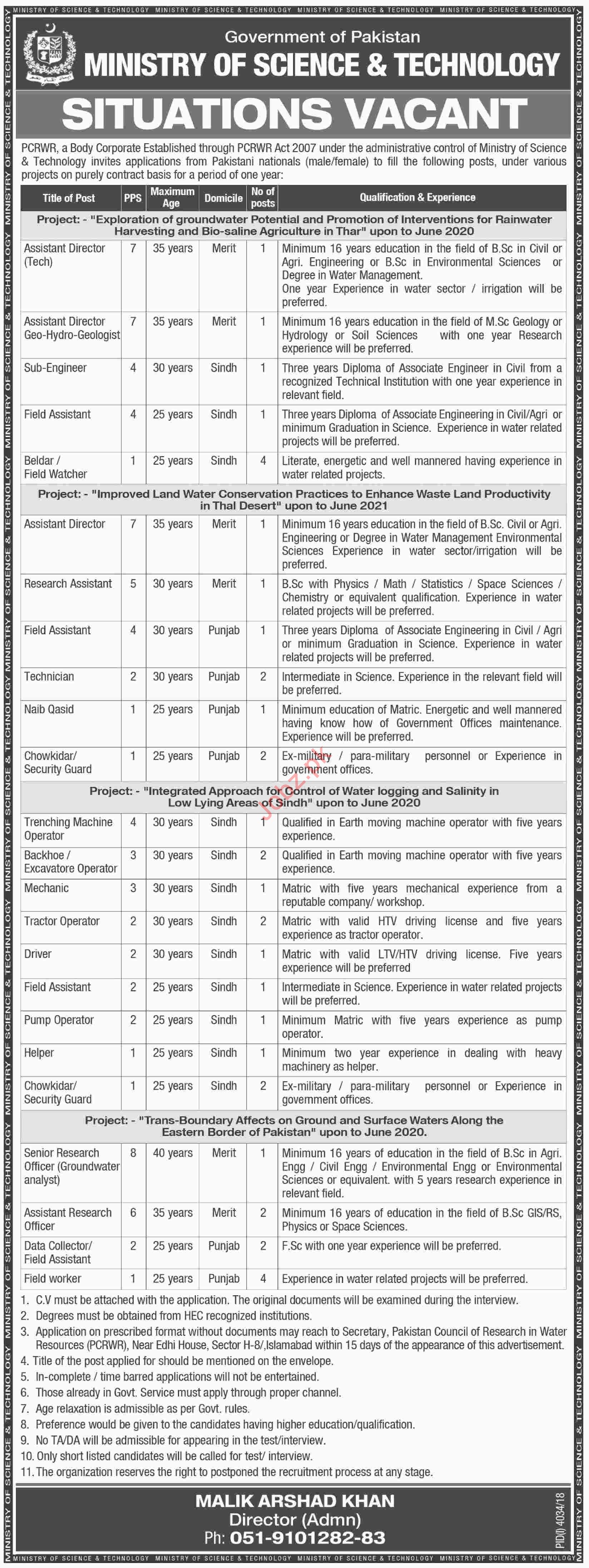 Ministry of Science and Technology MOST is looking for Assistant Director Technical, Assistant Director General Hydro Geologist, Sub Engineer, Field Assistant, Assistant Director, Research Assistant, Field Assistant, Technician, Chowkidar, Trenching Machine Operator, Backhoe Operator, Excavator Operator, Tractor Operator, Driver, Pump Operator, Helper, Chowkidar, Security Guard in Islamabad.