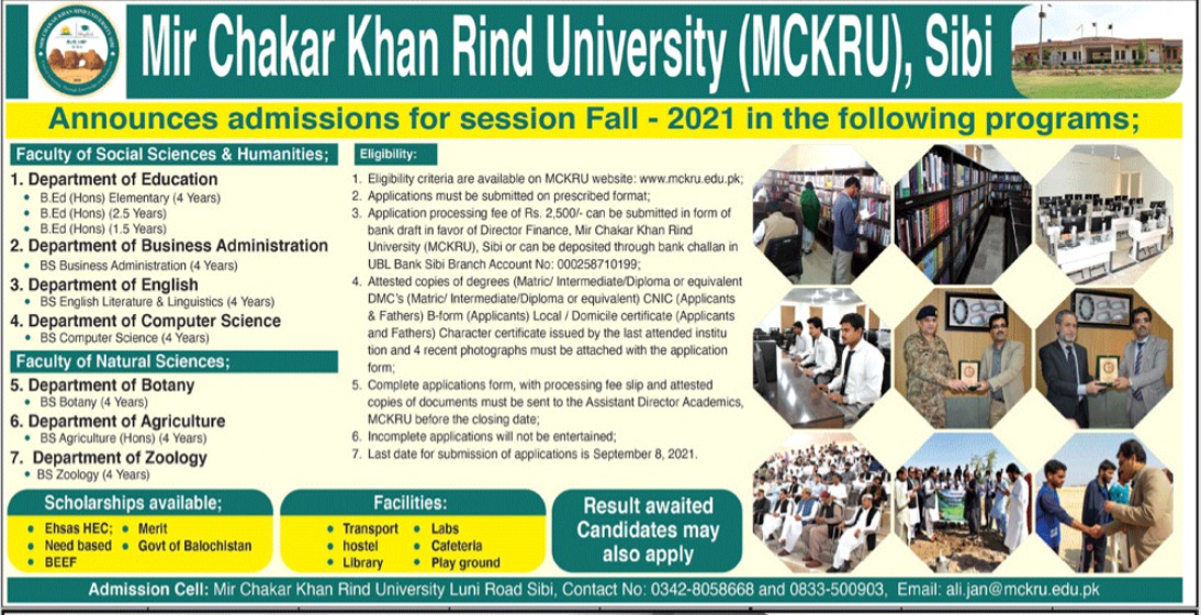 Mir Chakar Khan Rind University MCKRU is a public sector university has announced admissions in B.Ed Hons & BS degree programs in Sibi Balochistan 2021. Read newspaper ad for exact details.