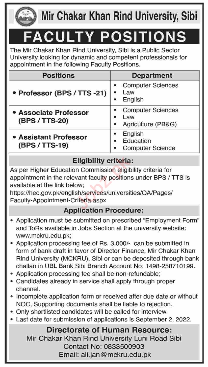 Mir Chakar Khan Rind University MCKRU is looking for candidates for following posts as per job advertisement published in daily Dawn Newspaper of August 15, 2022 for location Sibi, sibi Balochistan Pakistan: