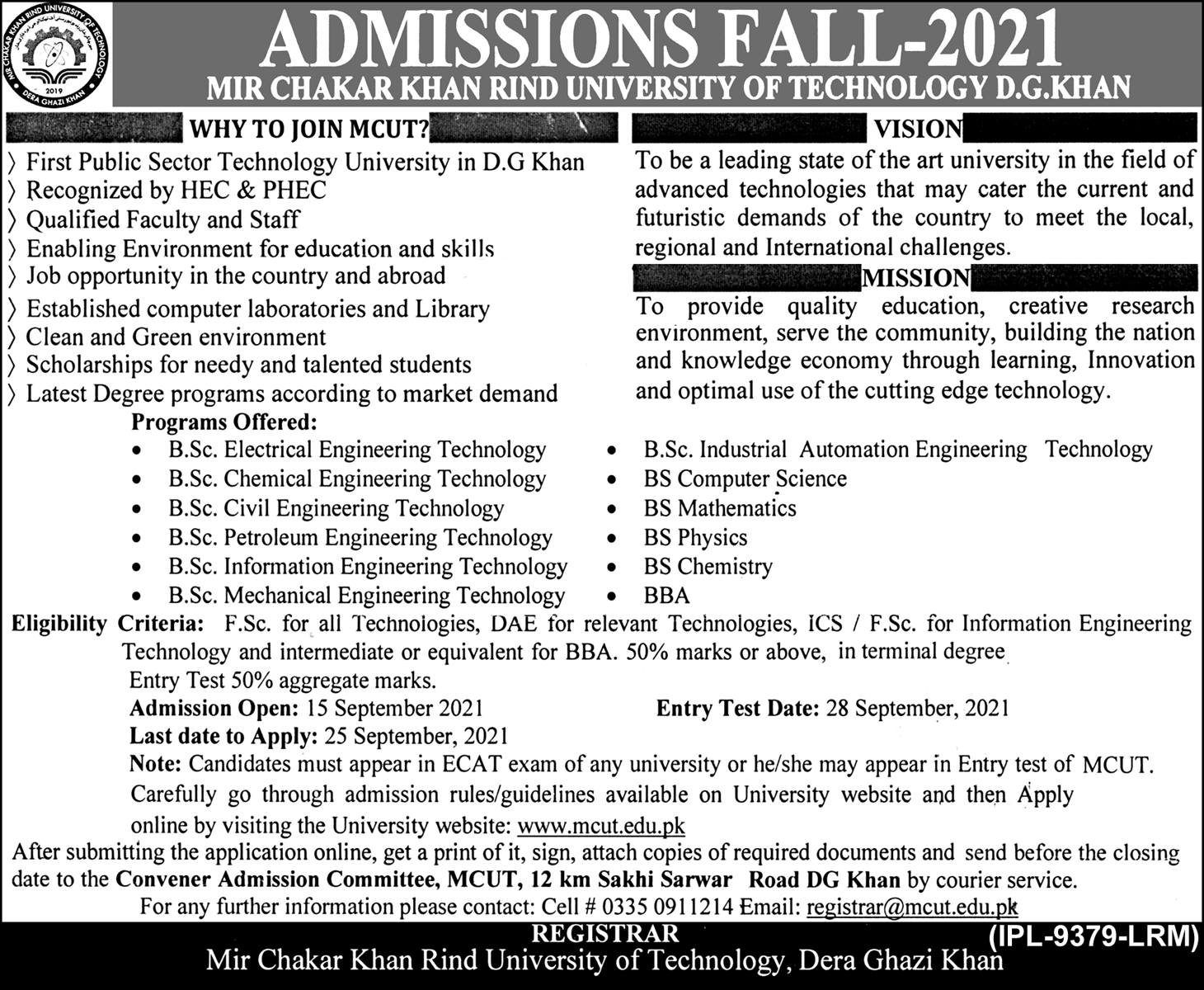 Mir Chakar Khan Rind University of Technology DG Khan is a public sector university has announced admissions in BSc Engineering Technology, BS and BBA degree programs 2021. Read newspaper ad for exact details.