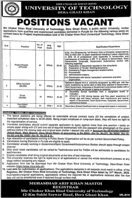 Mir Chakar Khan Rind University of Technology invites applications for job positions advertised in daily The News dated 11 March 2025 for following vacancies in Dera Ghazi Khan, dera ghazi khan Punjab Pakistan.