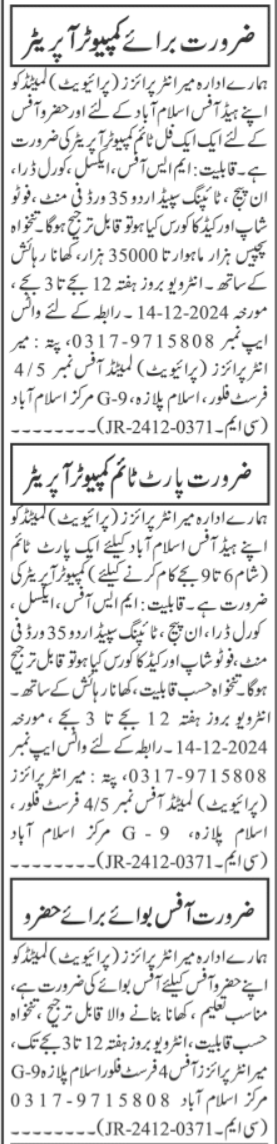 Mir Enterprises Islamabad Jobs 2024 for Computer Operator