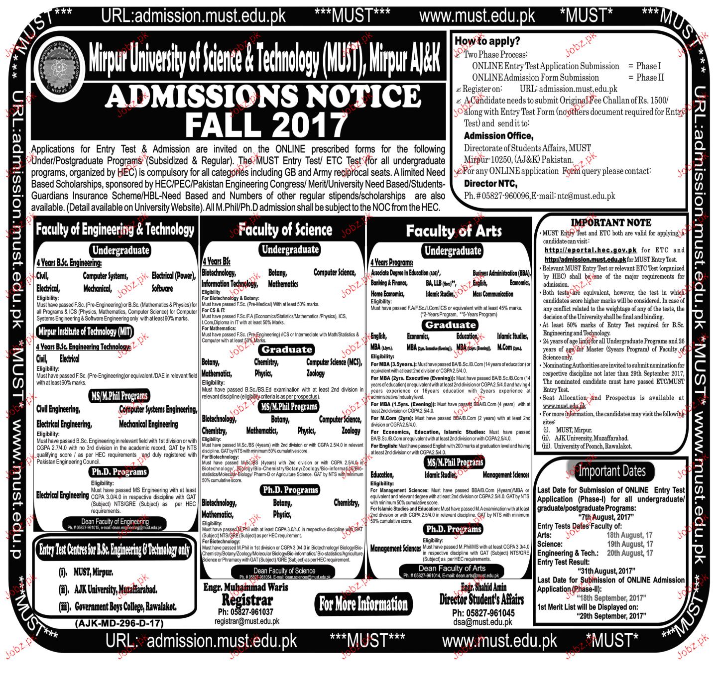 Mirpur University of Science and Technology MUSt Admission in Undergraduate Programs in Mirpur. Read newspaper ad for exact details.