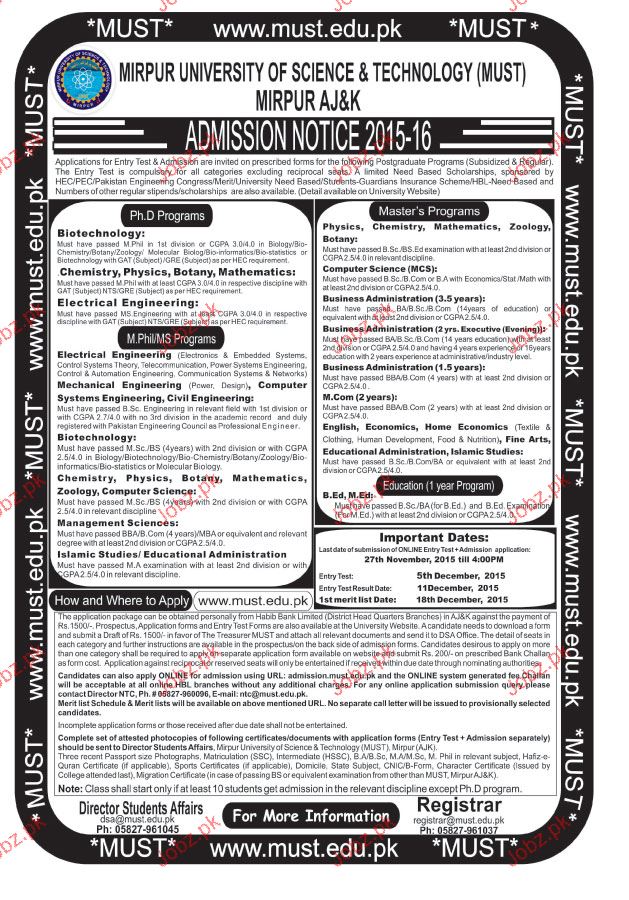 Mirpur University of Science & Technology Admission in Phd in Mirpurkhas. Read newspaper ad for exact details.