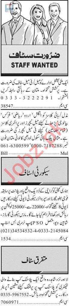 English Teacher, Urdu Teacher, Math Teacher, Physics Teacher, Biology Teacher, Security Guard, Security Supervisor and Machine Operator Jobs at Misali Public High School, Multinational Company, Security Company and Plastic Manufacturing Company in Lahore.
