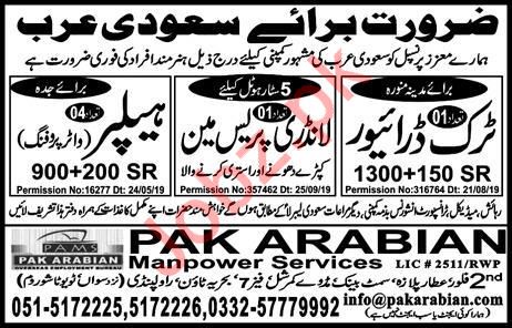 Vacancies in Pak Arabian Manpower Services Advertisement October 2019