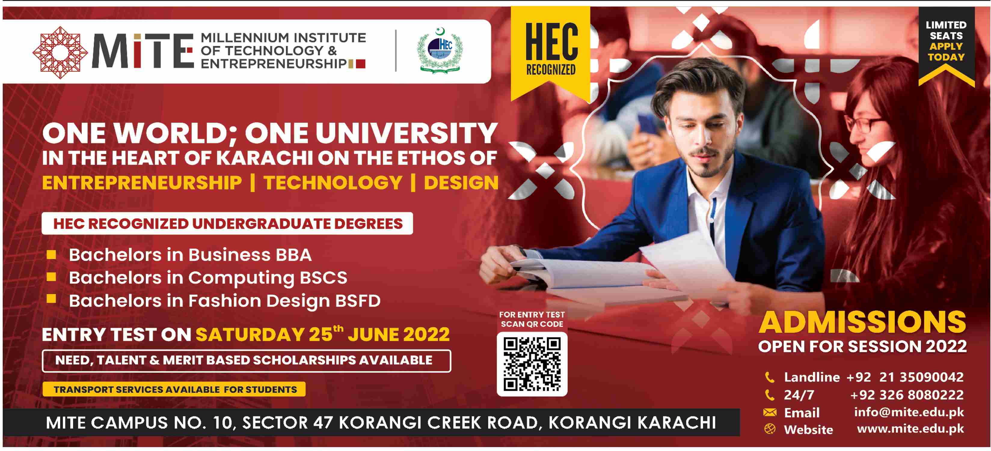 The Millennium Institute of Technology & Entrepreneurship admissions 2022 for Bachelor in Business Administration BBA, Bachelor in Computing Science BSCS, Bachelor in Fashion Design BSFD has been announced. The Millennium Institute of Technology & Entrepreneurship Karachi Sindh Pakistan welcomes students to apply for admissions in academic year 2022 in Science University. Eligible students for fulfilling criteria for admissions in BBA, Bachelor and BS can enroll as per Government admission policy 2022 till closing date 25 June 2022. Read newspaper ad for exact details.