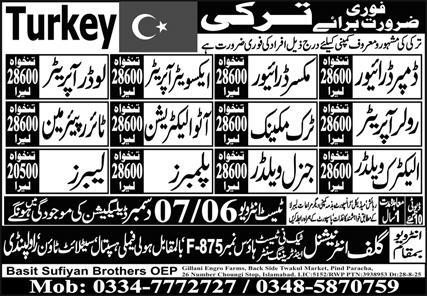 Basit & Sufyan Brothers jobs advertisement dated about 5 December 2025 in daily Express Newspaper invites application for the vacant post of htv driver, driver, welder, electric welder, mixer driver, truck mechanic, loader operator, general welder, auto electrician, roller operator, labor, plumber, excavator operator, dumper driver and tyre repairman in Istanbul, ankara Turkey. Matric, DAE, Bachelor and Intermediate etc. educational qualification will be preferred.