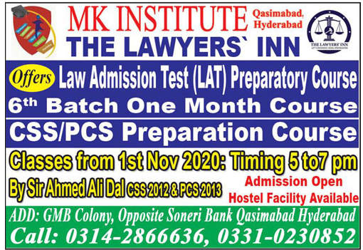 MK Institute The Lawyers INN has announced admission for 6th Batch One Month Law Admission Test LAT Preparatory Course in Qasimabad Hyderabad Sindh Pakistan 2020. Read newspaper ad for exact details.
