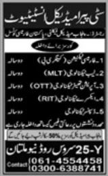 Admissions in City Medical Institute 2024 for MLT, OTT, RIT has been announced. Students who want to take admissions in Multan Punjab Pakistan for academic year 2024 to continue education in Medical Diploma can apply. Students who want to enroll for academic session 2024 in qualification and admission criteria for Private institute can apply till last date. Read newspaper ad for exact details.