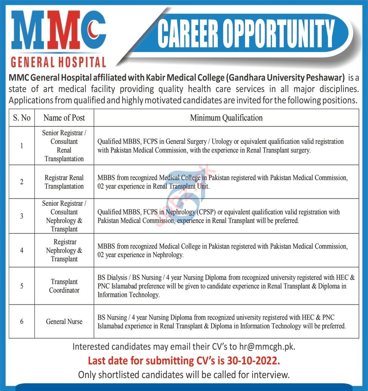 MMC General Hospital Peshawar, peshawar Khyber Pakhtunkhwa KPK Pakistan invites applications from eligible candidates for the post of transplant consultant, registrar retal transpotation, consultant nephrology transplant, general nurse and consultant renal transportation as per advertisement of October 16, 2022 published in daily Jang Newspaper. Preferred Education is MBBS, Matric, Bachelor and Master etc.