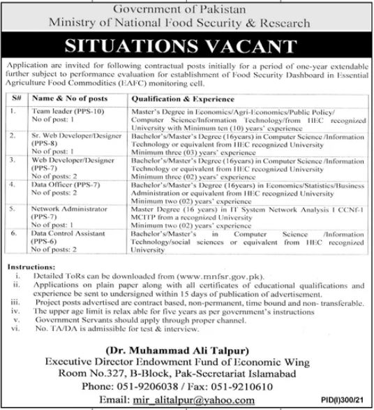Ministry of National Food Security & Research MNFSR, Islamabad invites applications from highly qualified, experienced and professional candidates for the vacant posts of Team Leader, Web Developer, Web Designer, Data Officer, Network Administrator, Data Control Assistant.