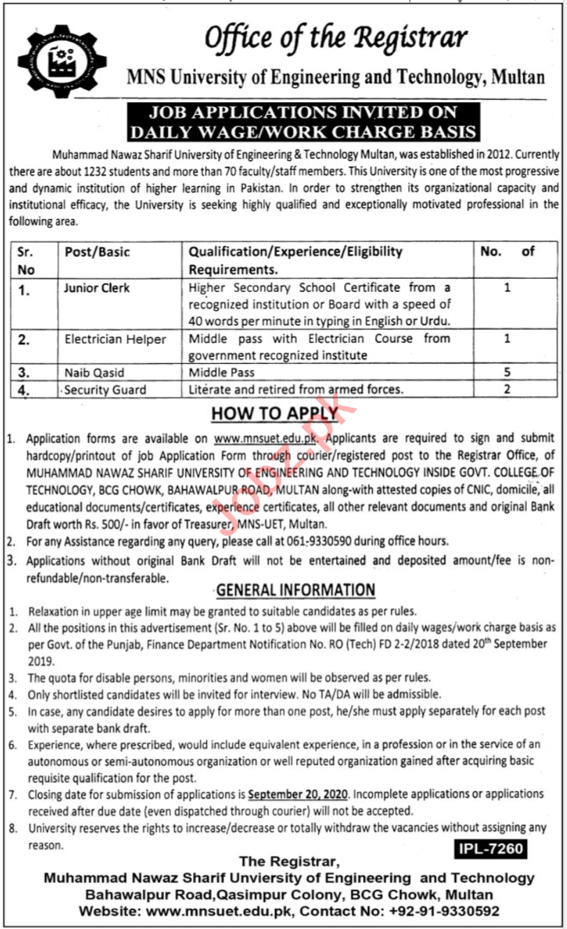 Vacancies in Muhammad Nawaz Sharif University of Engineering & Technology Advertisement August 2020