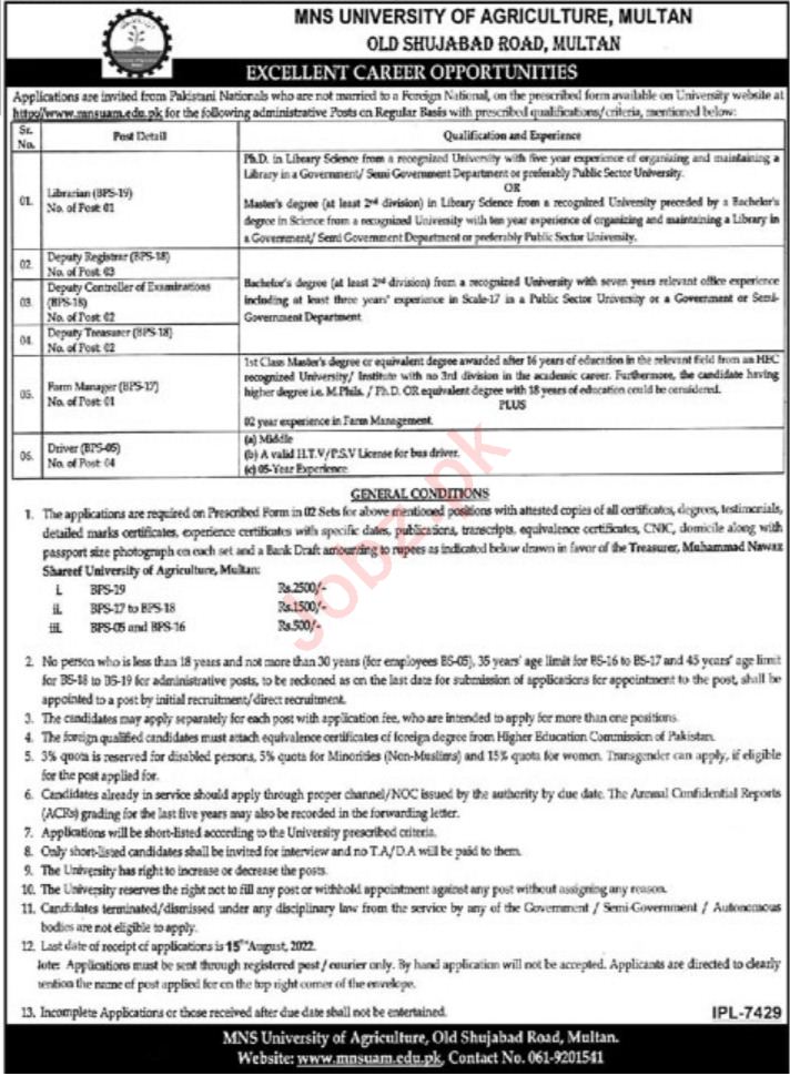 MNS University Of Agriculture invites applications for job positions advertised in daily Khabrain dated 21 July 2022 for following vacancies in Multan, multan Punjab Pakistan.