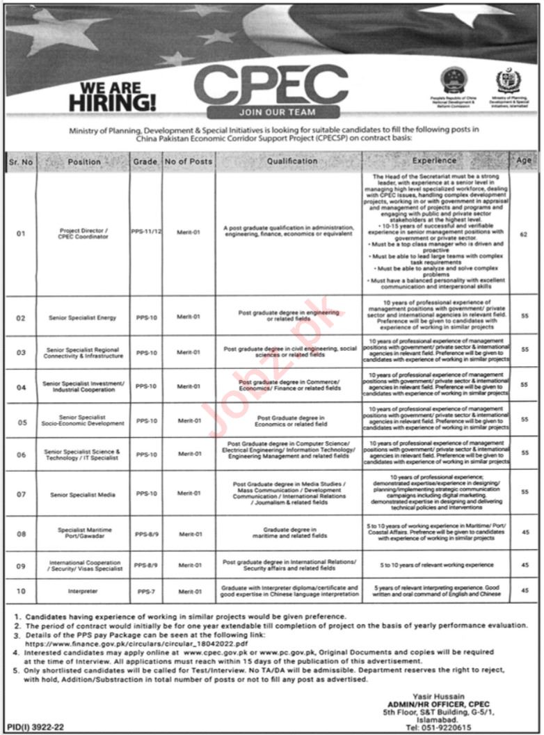 Ministry of Planning Development and Special Initiativem CPEC jobs advertisement dated about 25 December 2022 in daily Jang Newspaper invites application for the vacant post of specialist maritime port, international cooperation, project director cpec, specialist regional connectivity infrastructure, specialist science technology, specialist industrial cooperation, it specialist, media specialist, project director, cpec coordinator, specialist socio economic development, international security specialist, visas specialist, interpreter, specialist investment and specialist energy in Islamabad, islamabad Islamabad Pakistan. Candidates with MBA, Mphil, Master, M.com, MS, Bachelor and M.sc etc. educational background will be preferred.