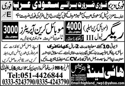 High Land International Riyadh, dammam Saudi Arabia invites applications from eligible candidates for the post of rigger, mobile crane helper and mobile crane operator as per advertisement of May 3, 2023 published in daily Express Newspaper. Preferred Education is Bachelor, DAE, Intermediate, BA and Matric etc.