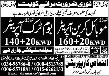 Al Namas Coporation Kuwait, kuwait Kuwait invites applications from eligible candidates for the post of mobile crane operator and boom truck operator as per advertisement of June 22, 2025 published in daily Express Newspaper. Preferred Education is Intermediate and Matric etc.