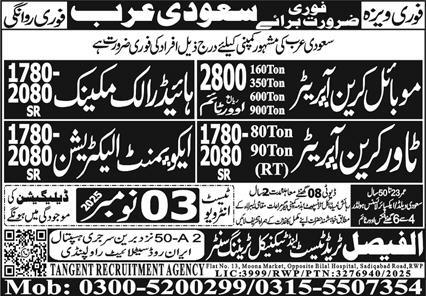Vacant posts including equipment electrician, tower crane operator, mobile crane operator and hydraulic mechanic are announced in Tangent Recruitment Agency Overseas Employment Promoters Riyadh, riyadh Saudi Arabia as per 3 November 2025 advertisement in daily Express Newspaper. Persons with Middle and Matric etc. education can apply.