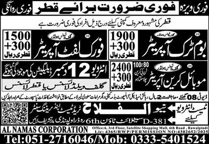 Vacant posts including mobile crane operator, boom truck operator and fork lift operator are announced in New Al Falah Trade Test & Training Center Doha, doha Qatar as per 11 December 2025 advertisement in daily Express Newspaper. Educational qualifications required Intermediate, DAE, Bachelor and Matric etc.