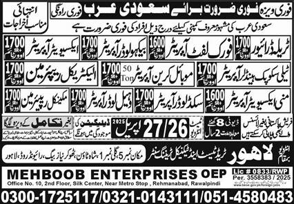 Vacant posts including mechanical repairman, excavator operator, telescopic handler operator, mini excavator operator, duct fitter, driver, mobile crane operator, traila driver, electrical repairman, fork lift operator, backhoe loader operator, wheel loader operator, skid loader operator and electrician are announced in Lahore Trade Test & Technical Training Center Riyadh, al khobar Saudi Arabia as per 24 April 2025 advertisement in daily Express Newspaper. Educational qualifications required Intermediate, Bachelor, Matric and DAE etc.