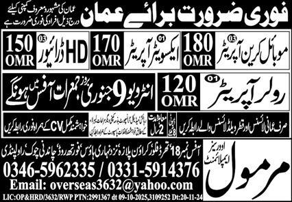 Marmol Overseas Employment is looking for candidates for following posts as per job advertisement published in daily Express Newspaper of January 9, 2025 for location Muscat, muscat Oman: