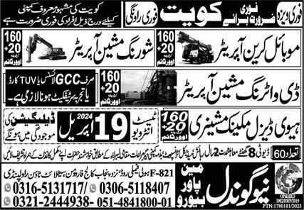 Vacant posts including heavy diesel mechanic machinery, heavy diesel mechanic, mobile crane operator, shoring machine operator and dewatering machine operator are announced in New Gondal Manpower Bureau Kuwait, kuwait Kuwait as per 16 April 2024 advertisement in daily Express Newspaper. Persons with Bachelor, DAE, Intermediate and Matric etc. education can apply.