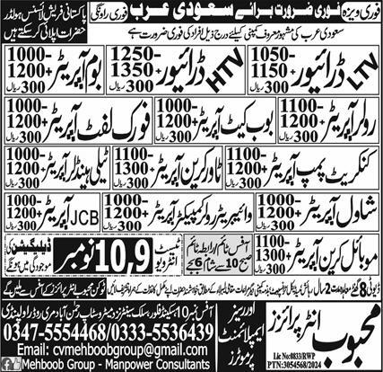 Mehboob Enterprises Overseas Employment Promoters invites applications for job positions advertised in daily Express dated 4 November 2024 for following vacancies in Saudi Arabia, saudi arabia Saudi Arabia.