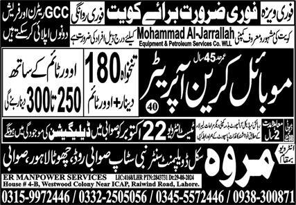 Marwa Skill Development Center Kuwait, kuwait Kuwait invites applications from eligible candidates for the post of mobile crane operator as per advertisement of October 19, 2024 published in daily Express Newspaper. Matric and Intermediate etc. educational qualification will be preferred.