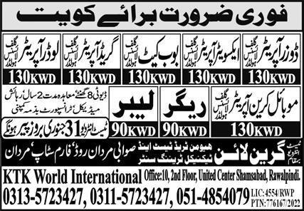 Green Line Human Resources Power Kuwait Kuwait invites applications from eligible candidates for the post of doors operator, excavator operator, loader operator, grader operator, rigger, mobile crane operator, labor and bobcat operator as per advertisement of January 29, 2022 published in daily Express Newspaper. Persons with Intermediate and Matric etc. education can apply.