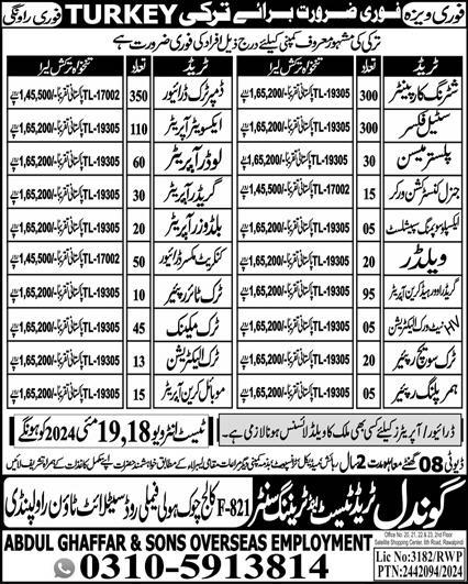 Gondal Trade Test & Training Center Istanbul, ankara Turkey invites applications from eligible candidates for the post of Loader Operator, Buildozer Operator, Hammer Pulling Repairer, Dumper Truck Driver, Truck Tire Repairer, Mason Plasterer, Welder, Shuttering Carpenter, Greeder Overhead Crane Operator, General Construction Worker, Greeder Operator, Truck Electrician, Hv Network Electrician, Concrete Mixer Driver, Mobile Crane Operator, Excavator Operator, Truck Mechanic, Steel Fixer and Truck Sewage Repairer as per advertisement of May 16, 2024 published in daily Express Newspaper. Educational qualifications required Bachelor, DAE, Intermediate and Matric etc.