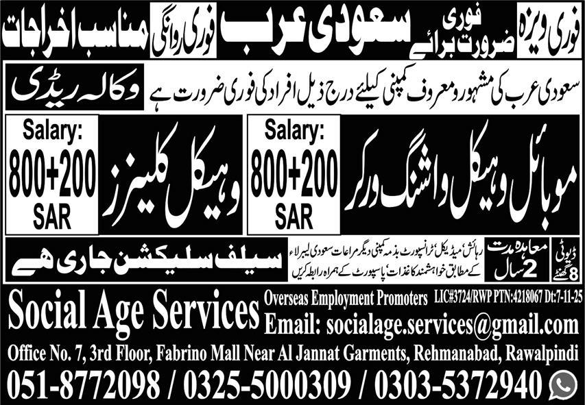 Vacant posts including mobile vehicle washing worker and vehicle cleaner are announced in Social Age Services Overseas Employment Promotors Jeddah, dammam Saudi Arabia as per 21 November 2025 advertisement in daily Express Newspaper. Preferred Education is Matric and Middle etc.