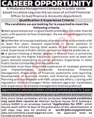 Modaraba Management Company Limited Lahore, lahore Punjab Pakistan invites applications from eligible candidates for the post of chief financial officer as per advertisement of May 5, 2024 published in daily Dunya Newspaper. Candidates with Bachelor, MS and Master etc. educational background will be preferred.