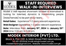 Modek Interior Pvt Limited Islamabad, islamabad Islamabad Pakistan invites applications from eligible candidates for the post of retail sales and web designer as per advertisement of January 14, 2024 published in daily Jang Newspaper. Preferred Education is Master and Bachelor etc.
