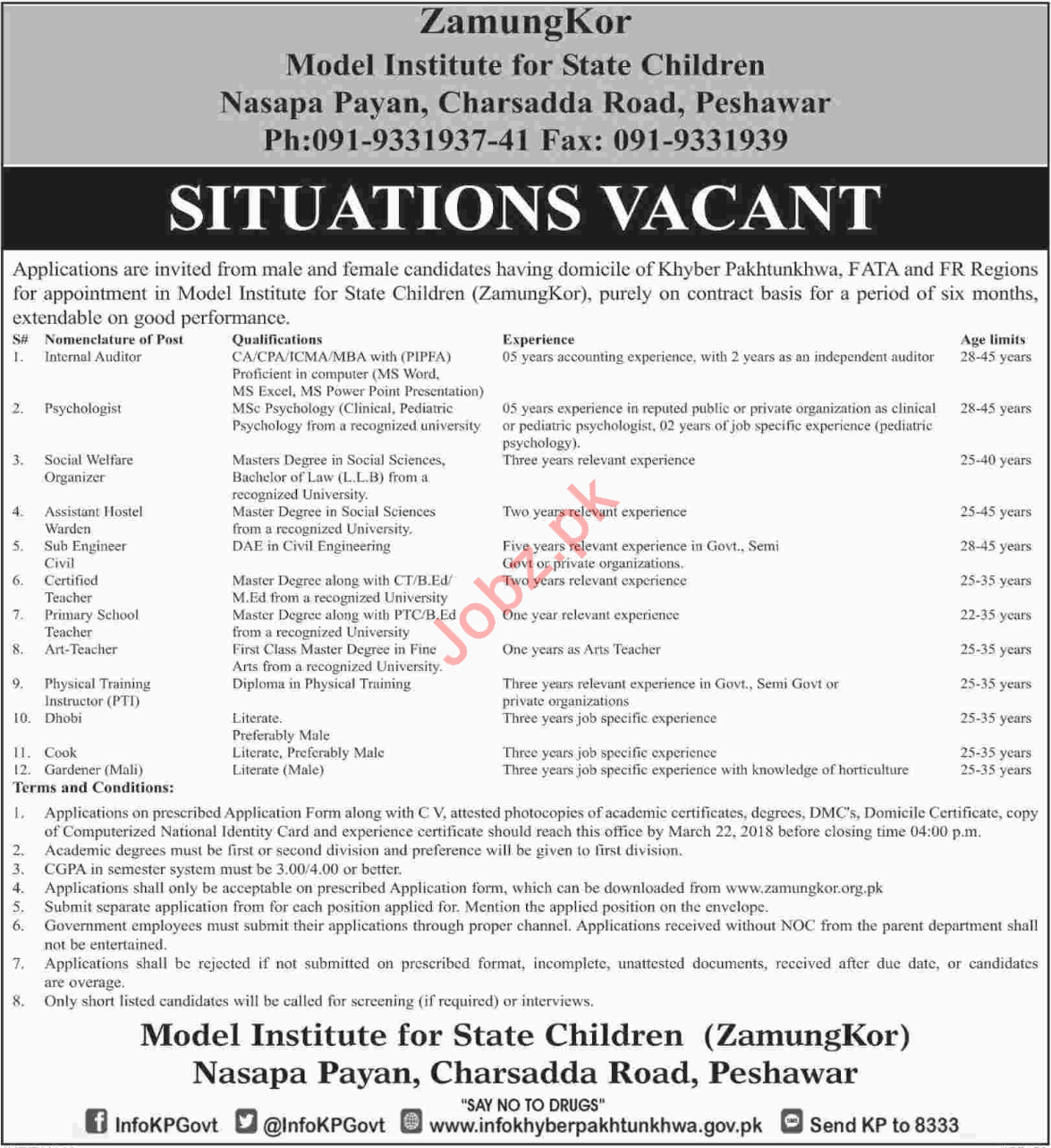 Model Institute for State Children Zamung Kor Peshawar, Pakistan seeks candidates for the posts of Internal Auditor (CA, CPA, ICMA, MBA, PIPFA, Ms Word, Ms Excel, MS Powerpoint), Psychologist (MSc Clinical, Pediatric), Social Welfare Organizer, Assistant Hostel Warden, Sub Engineer Civil, Certified Teacher, Primary School Teacher, Art Teacher, Physical Training Instructor, Dhobi, Cook and Gardener (Mali).