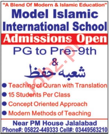 Model Islamic International School , A Nlend of Modern & Islamic Education invites applications fro admissions for Play Group to 9th Class and Hifz ul Quran in Jalalabad Muzaffarabad AJ&K. Read newspaper ad for exact details.