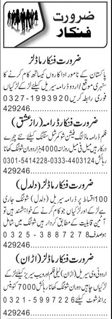 Latest Acting Modeling jobs and others Classifieds jobs in Media Sector closing date is around May 18, 2024, see exact from ad. Read complete ad online to know how to apply on latest Media Sector job opportunities. Learn today skills like Fashion Modeling and Acting to apply confidently on these Media Sector jobs. On job transport, food and accommodation facility is provided.