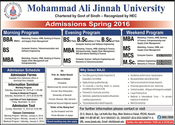 Mohammad Ali Jinnah University Admission inBBA, BS, MBA, MS, MCS and BSc in Karachi. Read newspaper ad for exact details.