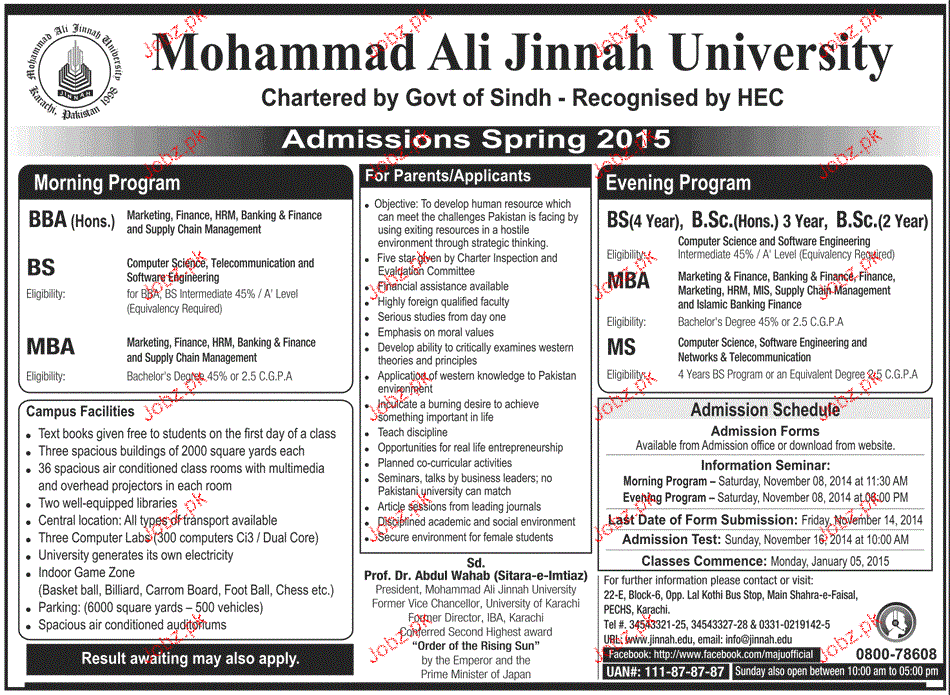 Mohammad Ali Jinnah University Admission in BBA, BS, MBA and Ms in Karachi. Read newspaper ad for exact details.