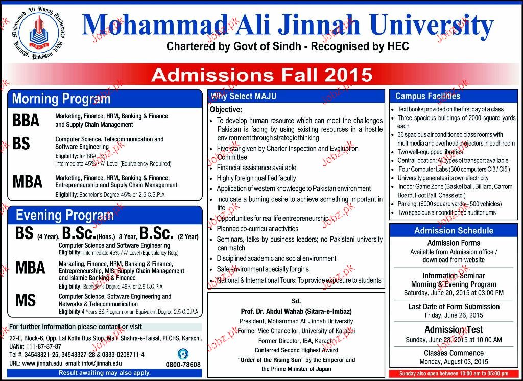 Mohammad Ali Jinnah University Admission in BBA, BS,MBA and MS in karachi. Read newspaper ad for exact details.