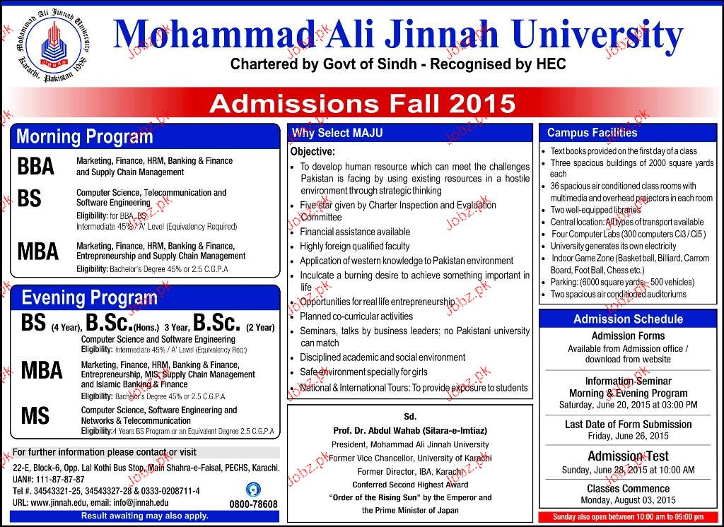 Mohammad Ali Jinnah University Admission in BBA, BS, MBA and MS in Karachi. Read newspaper ad for exact details.