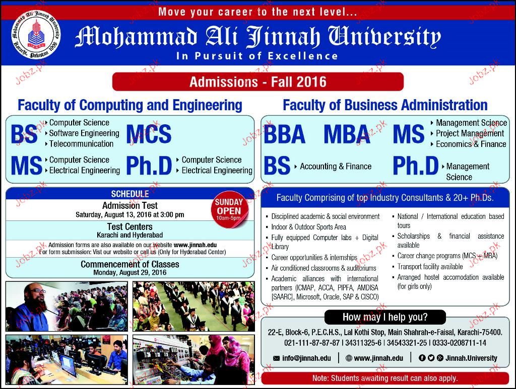 Mohammad Ali Jinnah University Admission in BS, MCs and Phd in Karachi. Read newspaper ad for exact details.