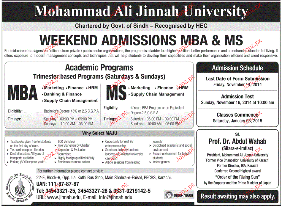 Mohammad Ali Jinnah University Admission in MBA and MS in Karachi. Read newspaper ad for exact details.