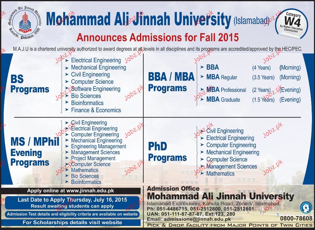 Mohammad Ali Jinnah University Admission in MBA, MS and Mphill in Islamabad. Read newspaper ad for exact details.