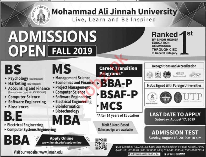 Mohammad Ali Jinnah University MAJU Karachi, Pakistan are announcing admissions fall 2019 for the classes of BS, MS, BE, BBA, BBA Hons, MBA, BBA-P, BSAF-P, MCS. Read newspaper ad for exact details.