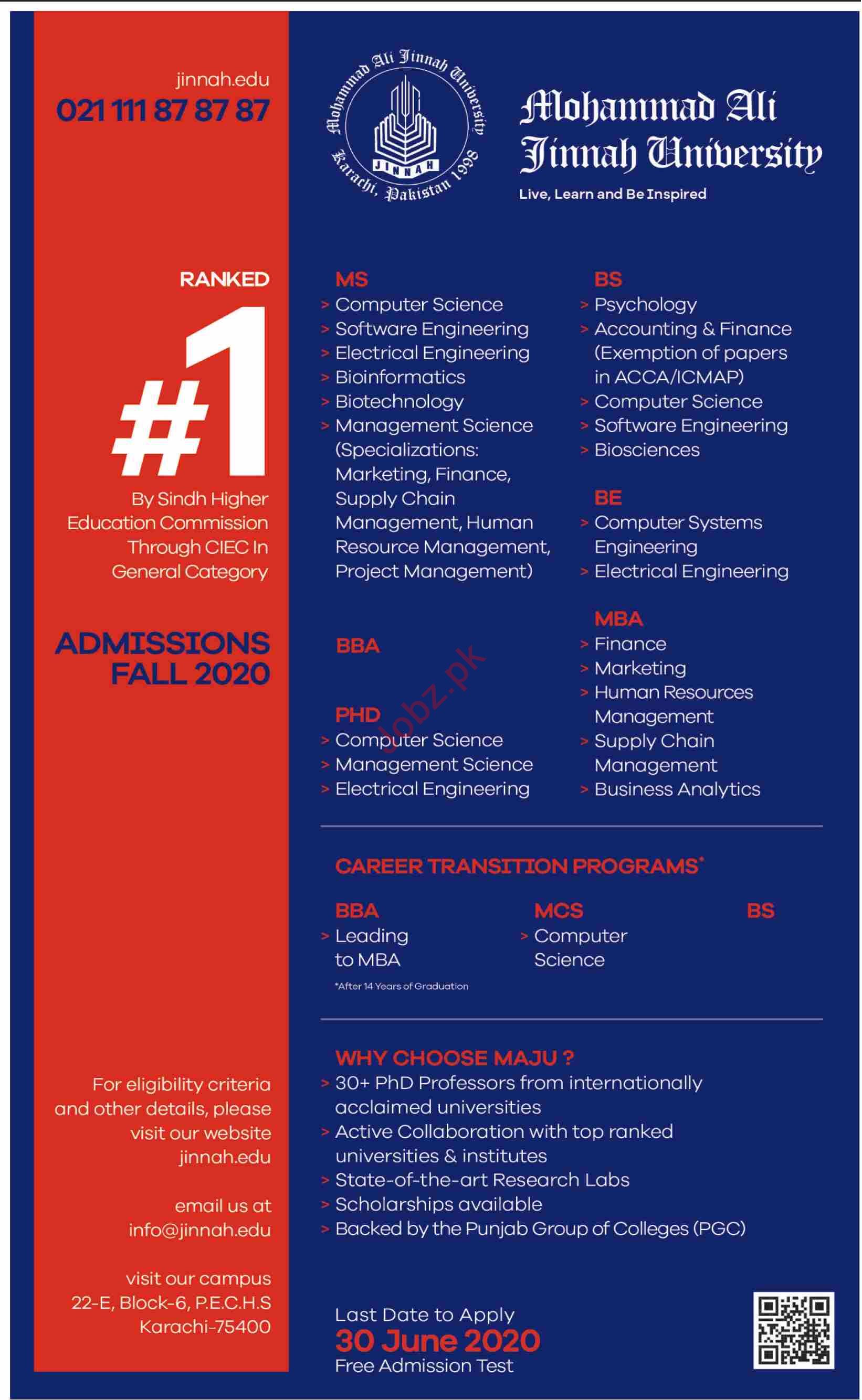 Mohammad Ali Jinnah University MAJU Karachi, Pakistan is opening admissions fall 2020 for the classes of BS, MS, BE, BBA, MBA & PhD in Computer Science & Electrical Engineering. Read newspaper ad for exact details.
