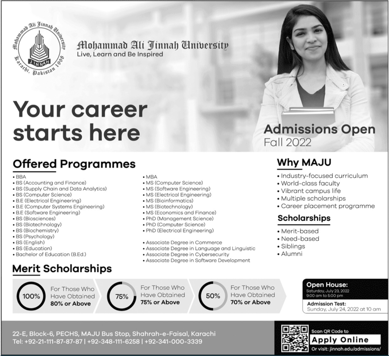 Mohammad Ali Jinnah University admissions 2022 for BBA, BS in Accounting and Finance, Computer Science, Software Engineering, Biosciences, Biotechnology, Economics, Psychology, MBA, MS in Management Science, Computer Science, Software Engineering, Electrical Engineering, Bioinformatics, Biotechnology, Economics and Finance, MBA Finance, Marketing, Human Resource Management, Linguistics and Supply Chain Management, PhD in Management Sciences, Computer Science, Electrical Engineering, MS Management Science Specializations in Marketing, Finance, Human Resource Management, Supply Chain Management, Project Management has been announced. Students can enroll for admissions in Mohammad Ali Jinnah University Karachi Sindh Pakistan for academic year 2022 to continue campus based or online education in Science University. Students who want to enroll for academic session 2022 in MBA, Bachelor, BBA, MS and BS qualification and admission criteria for Government institute can apply till last date 24 July 2022. Read newspaper ad for exact details.