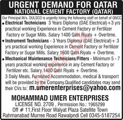 Vacant posts including fitter, instrument technician, mechanical maintenance technician and electrical technician are announced in Mohammad Umer Enterprises Rawalpindi, rawalpindi Punjab Pakistan as per 22 October 2023 advertisement in daily Jang Newspaper. Educational qualifications required Intermediate and Matric etc.